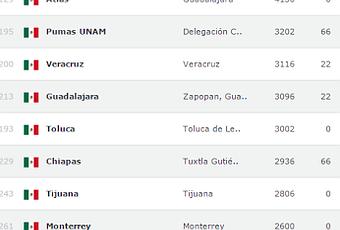 Los de "Tuca" han ido a la baja en ranking, apenas en junio aparecían en el sitio 37, pero después de estos meses ha caído hasta el lugar 51; aún así, no existe otro club azteca que lo supere.