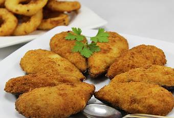 5- Rellenar las conchas, pasar por huevo batido y pan rallado, apretando bien para que se quede adherido el rebozado y freír en abundante aceite caliente, sólo que se doren.