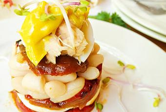 En el plato de servir colocar un aro de emplatar, en el fondo poner pimiento de piquillo, rodajas de huevo duro, pimiento,alubias, pimiento, atúny coronar con un poco de mahonesa de ajo con azafrán.