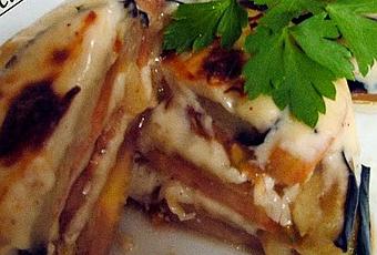 Cortamos la berenhenas y los tomates en rodajas mas bien gordas,de manera que cada timbal lleve 3 rodajas de tomate y 3 de berenhenas.Reservamos las rodajas de tomate y las berenhenas las freímos en aceite,cuando estén fritas vamos montando el timbal,ponemos de base una rodaja de tomate, otra de berenhena, encima de esta un poco de queso rallado y volvemos a poner otra rodaja de tomate,berenhena y queso y así hasta terminar con las 3 rodajas de cada uno.Las ponemos en una fuente apta para el horno y reservamos mientras preparamos la bechamel.Para la salsa bechamel cogeremos una sartén antiadherente honda y pondremos la mantequilla a derretir con el aceite.Una vez derretida, se añade la harina,se dan unas vueltas con una cuchara de madera y se le va añadiendo poco a poco la leche fría, sin dejar de dar vueltas para que no se formen grumos.Cuando se ha incorporado toda la leche se deja unos 10 minutos a fuego medio hasta que esta vaya espesando si dejar de remover.Una vez lista añadiremos la sal y la nuez noscada nunca antes ya que la bechamel va reduciendo y la podemos poner salada.La bechamel para esta receta debe de quedar un poco espesa,aunque hay que tener en cuenta que una vez echa cuando se aparta del fuego tiende a espesar mas según se vaya enfriando.Ponemos la bechamel por encima de los timbales,añadimos un poco de queso y lo metemos a gratinar al horno hasta que este dorado.