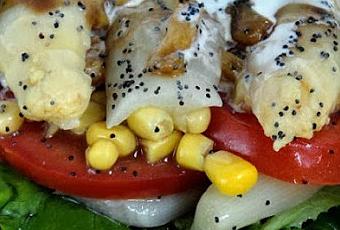 - Colocar un aro en la base del plato y rellenar con lechugas variadas, rodajas de tomate cortadas finas, maíz cocido, aceitunas negras a rodajas y los espárragos blancos PEDRO LUIS cortados en dos. Rociar con la vinagreta de melocotón, un chorrito de mayonesa diluida con agua y unas semillas de sésamo negro o de amapola.