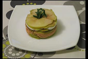- Coloca un aro de emplatar y comienza a colocar una capa de manzana, después otra más gruesa de foie, otra de manzana, otra de queso de cabra y otra de manzana.