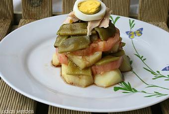 - Monta el timbal con capas sucesivas de patata, tomates, judías verdes y bonito.Ve comprobando de sal porque le tendrás que poner un poco al tomate.