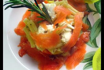 Ahora sólo queda montar el plato. Necesitaremos, para dos personas: 150/200 gramos de salmón ahumado, 100 gramos de queso de cabra de rulo y un aro de emplatar. Mezclaremos la verdura con la pasta, la mitad del salmón y del queso. Llenar el aro y coronar con queso, para finalizar con el salmón como última capa.