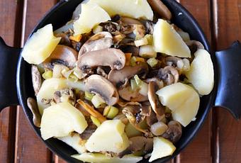 En una sartén cocemos los champiñones, los camagrocs y los ajos tiernos. Se pueden cocer juntos o por separado, en función de si lo queremos presentar con diferentes capas o sólo con dos (patata + mezcla).