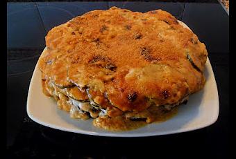 Montar el timbal en un molde desmontable redondo; colocar un fondo de patatas, cubrir con unas cucharadas de salsa de tomate y queso rallado; la siguiente capa de berenjena con bechamel y queso, se sigue alternando capas hasta terminar los ingredientes terminando con salsa bechamel y queso.