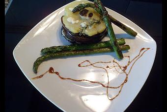verduras frescascalabacinberenjenacebollaesparragos y un poquito de queso roquefor 2 patatas grandesAceite de olivaSal y pimienta negra recién molida Lavamos muy bien las verduras una por una, secamos cada pieza de las hortalizas que vamos a cocinar.Introducimos las patatas sin pelar en un bol y las metemos al microondas durante diez minutos a fuego alto. En ese tiempo cortaremos todas las verduras. Desechamos los extremos de la berenjena y la cortamos en rodajas de medio centímetro. Rociamos con sal y las dejamos en un plato durante 15 minutos para que suden el amargor. Luego las pasamos por agua fría para quitarle el exceso de sal.Desechamos los extremos de los calabacines y los cortamos en rodajas de medio centímetro. Reservamos.Los espárragos los dejamos tal cual, sólo cortaremos los extremos del tallo a la altura en que se vuelve más leñoso y duro.