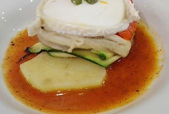 Para montar el plato: colocar una cama de 2 rodajas de patatas, unas pocas judías verdes encima de las patatas, seguida de las tiras de calabacín, las llanegas y las rodajas de tomate. Por último coronar con el queso de rulo de cabra y adornar con unas judías verdes a trozos.En una jarrita tendremos puesta la salsa de romesco, que se añadirá alrededor de las verduras.