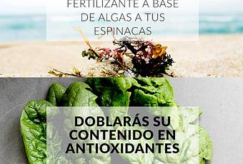Despertó mi curiosidad al instante, y visité su página web, allí explicaba que algunos estudios habían demostrado que aplicar en spray abono de algas a las hojas dos semanas antes de su cosecha multiplica su poder antioxidante, en espinacas hasta lo podía doblar. Esto funciona para los cultivos de hojas de ensalada, incluyendo la col y el brocoli.
