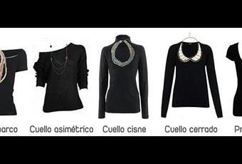 - Para un escote redondo con volumen , usar collares cortos o gargantillas pegadas al cuello que ayudan a estilizarlo y para cuellos redondos sin volumen apostar por collares tipo babero.