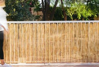 - Bambú: Su origen tropical de la región asiatica, el bambú se ha “colado” entre los diversos materiales para decorar y revestir vallas y cerramientos. Su grado de ocultación es muy bajo y suele utilizarse para fines meramente decorativos. Lo podemos ver en biombos, en barandillas de terrazas o piscinas, en terrazas de restaurantes o en otras estancias.