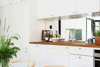 Una forma muy asequible y muy bonita de ganar amplitud cuando el espacio es muy pequeño, sobre todo, cuando lo que queda libre entre los armarios superiores y la bancada es tan mínimo. Duplicas luz y tamaño y queda así de bien.
