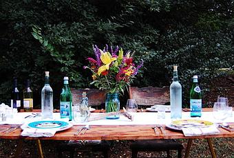 Si no tienes una mesa XXL para tus comidas al exterior, hazte con algunos caballetes y remata con un tablero tan grande como quieras que sea tu mesa. Puedes pintar el tablero, cubrirlo con una tela o papel de craft e, incluso, dejarlo como está cuidando la presentación de la mesa para conseguir un contraste con un punto rústico chic