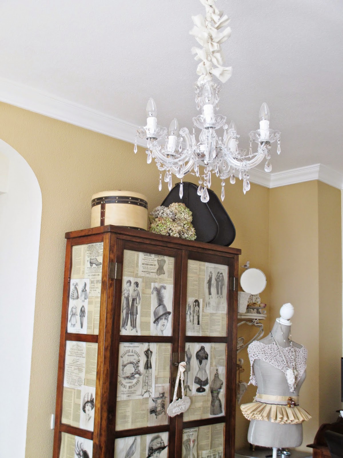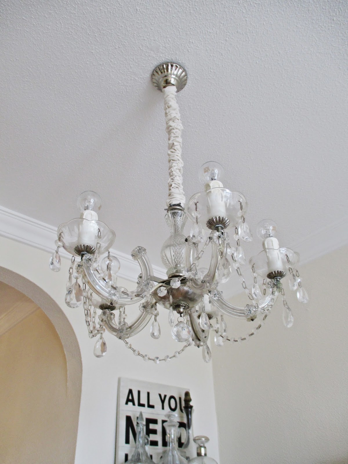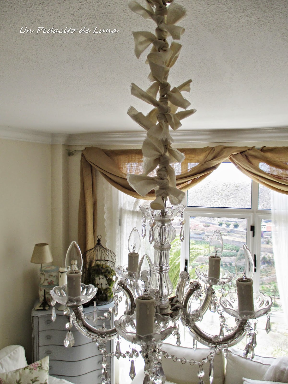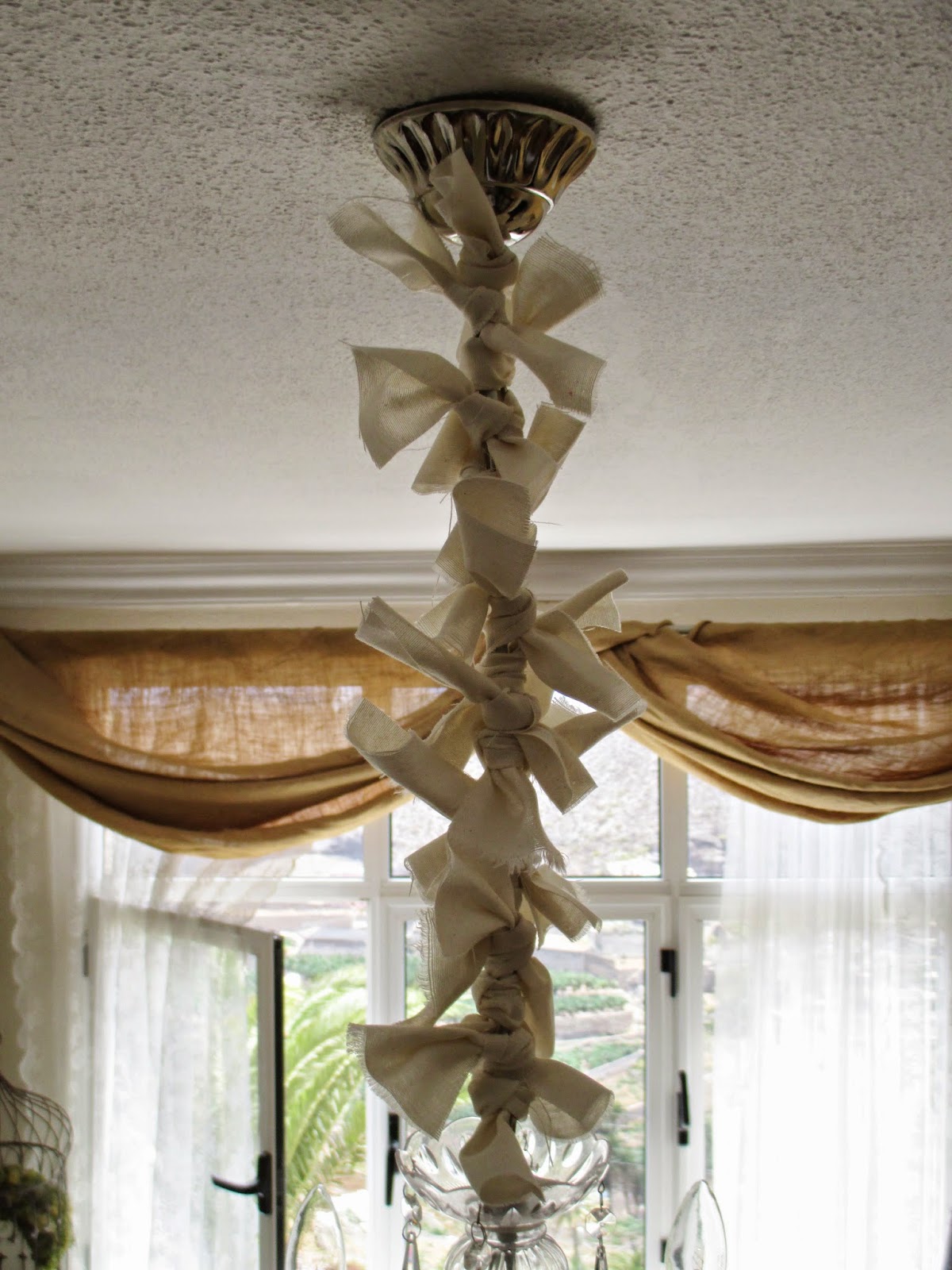 Así que inventé otro modo....Corté rectángulos de tela de unos 6 cms x 20 aprox. y sencillamentelos até haciendo un nudo a la cadena de la lámpara, así muy disparatados, unos hacia un lado, otros hacia otro....