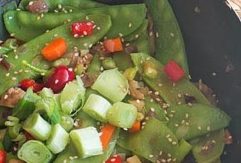 INGREDIENTES (2 pax)300g de tirabeques Media zanahoria2-3 setas shiitakesUn trocito de apioUn trocito de pimiento rojoUn diente de ajoUn trocito de jengibreUna cebolletaSemillas de sésamoGuindilla (opcional)Aceite de oliva suaveSalsa de pescadoSalsa de soja
