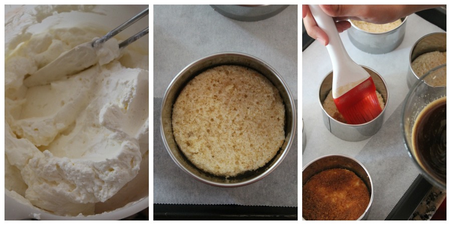 Montamos la nata con el mascarpone y el azúcar. Mezclamos los dos cafés solos con un buen chorro de whisky. En los aros metálicos colocamos la mitad del disco de bizcocho y con un pincel empapamos bien, sin sobrepasarnos, con el café con el whisky.