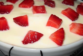 Cubrimos el fondo de los vasos con un par de bizcochos de soletilla, mojamos con la salsa o almíbar de fresas ya frío, cubrimos con la crema de queso fresco y encima echamos unos dados de fresas que teníamos reservados. Así susesivamente hasta completar cada vasito o bol.