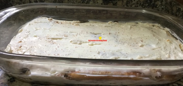 En un molde , ponemos una base de bizcochos o sobaos y empapamos con café mezclado, en un vaso, con un poco de azúcar y un poco de agua