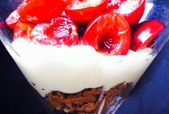 - Puedes sustituir las cerezas por fresas, plátano, piña o la fruta que más te guste, pero el contraste de colores con las primeras lo convierte en un postre muy atractivo y sugerente.