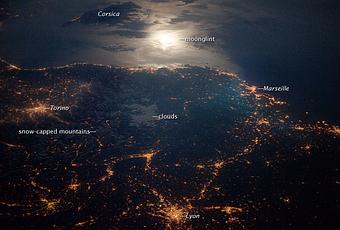Caption by William L. Stefanov, NASA-JSC¿Preciosa verdad? La imagen lo tiene todo, el reflejo de la luz de la Luna sobre el mar, la luz de ciudades como Lyon salpicando la oscuridad de la noche, pequeñas nubes sobre las ciudades... Pero la pregunta realmente interesante es ¿cómo es posible esta foto? Es posible porque tenemos la Estación Espacial Internacional orbitando la Tierra, pero además, y esto es lo más importante, la foto es posible por que una gran parte del alumbrado público de las ciudades sale proyectado hacia el espacio. Esto es un problema al que se conoce como contaminación lumínica. La contaminación lumínica es la causante de que por las noches no podamos ver apenas estrellas en el cielo, desde un sitio oscuro y si nuestros ojos no tiene defectos podemos distinguir a simple vista unas 6000 estrellas en una noche sin Luna, lo cual es una nimiedad comparado con los 100000 millones de estrellas que tiene la Vía Láctea, que es la galaxia a la que pertenecemos.