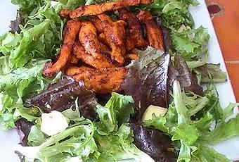 En fin, que me piden comidas más dietéticas, sanas y mucho menos calóricas que las bombas de chocolate.vale aquí hay una bien rica, por lo menos a mi me encanta: son Tiras de pollo( Chiken fingers pero son grasa ni harinas, ni fritas) al horno, con un aliño previo que las vuelve crujientes y sabrosas. Si le añadimos una ensalada fresca, afrutada y con algo de crujiente el plato queda muy completo y saciante. El saldo total son pocas calorías, que se pueden quemar con un agradable paseo a la caída de la tarde, siempre y cuando el paseo no sea a la cervecería a tomar 4 o 5 "birritas" con sus respectivas tapas. Unos yogures con frutas naturales bastará como cena. Por cierto que tengo que hacer la receta de estos yogurines para otra ocasión. La péridida de grasas está garantizada, así como la mejora y puesta en forma del "cuerpecito serrano de cada cual". Porque al final "cá uno es cá uno" como dijo el clásico.Los únicos elementos menos dietéticos son las dos cucharadas de azúcar, que es morena, el aceite, y 20 pistachitos de nada, divididos en 4 comensales es casi nada.