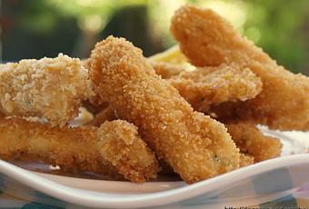 Cortamos la pechuga de pollo en tiras, y las pasamos por el batido, y luego por el pan crujiente