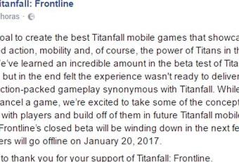 Si os interesó el anuncio de un Titanfall para móviles llamado Frontline, podéis ir despidiéndoos de él ya que ha sido cancelado. El proyecto no ha convencido en general y han decidido cortar de raíz antes de acarrear peores consecuencias.