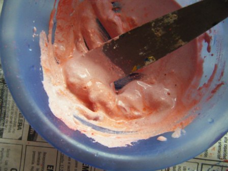1.- Mezclar el yeso con el agua y la pintura ( no deben quedar grumos en la mezcla ).