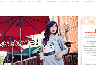 Inmediatamente al entrar nos encontramos con una selección de "lo más nuevo", te muestran el material que ha entrado último.Ubicándonos superiormente tenemos varias solapas donde al clikear nos llevan a distintos productos definidos por categorías: All, New, Drama, Tops, Dresses, Outer, Animal, Necklaces, Bracelets, Earrings, Cellphone, Nails y Misc.