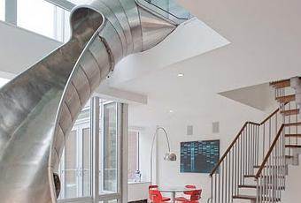 Siguiendo con la entretención, ahora veremos los toboganes en espacios interiores. ¿Que le parecería bajar desde el dormitorio, en el segundo piso de su casa, a la cocina en el primer piso, por medio de un tobogán? Como para comenzar un gran día.