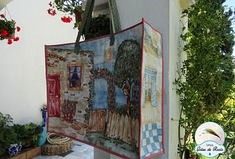 Esta es la otra cara del bolso, la favorita de Trini. Esta tela es un panel de una casa con jardín.