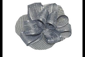 Mide sólo 14cm de diámetro, y está realizado con una base de gasa gris con rayitas y sobre ella una flor "desestructurada"