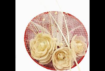 Está compuesto por una base en sinamay rojo sangre de unos 30cm de diámetro y adornado en color beige. El adorno está formado por flores en sinamay, velo, plumas y dos raquis largos.