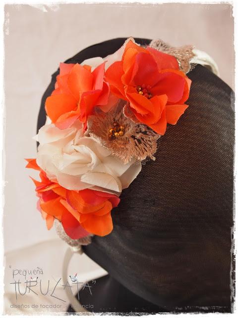Tocado tipo tiara modelo SARAEsta temporada de primavera, que, por otro lado, parece que no acaba de llegar, a todas nos apetece lucir un detalle en nuestro pelo en todos esos eventos, como bodas, comuniones, que se nos presentan por delante.Aunque la tendencia generalizada es lucir una pieza más pequeña y versátil, que podamos utilizar también en otras ocasiones, aunque, eso sí, sin renunciar a la comodidad y a ser originales, los tocados reducen su tamaño y ostentosidad y se hacen más discretos. Desde que, hace unas tres o cuatro temporadas, los tocados y tiaras están de moda, cada vez nos atrevemos más a llevar el nuestro y sentirnos tan favorecidas con este accesorio que realza la belleza del rostro de cada mujer.Estos dos modelos, VICTORIA y SARA, los hemos confeccionado a medida, también para dos clientas de nuestro punto de venta "ÎLEDE SACARI" (C/Arzobispo Mayoral nº7 - Valencia) y, siempre que podemos, los hemos bautizado con el nombre de sus propietarias.En el modelo Victoria el tul de red, de color gris claro, dota a ésta pequeña pieza tan colorista de un gran y necesario volumen, que contrastamos con algunos toques de color con plumas en azul intenso, gris azulado y negro.La diadema, tipo tiara, del modelo Sara nos transporta a un ambiente romántico repleto de flores, en colores beige, coral y blanco con tejidos como el encaje y la seda salvaje, así como la pedrería, cosida íntegramente a mano y la cinta de raso que se puede atar detrás con un bonito lazo, si llevas el pelo recogido, o bien entrelazarlas en una trenza, un tanto desestructurada, que descanse por encima del hombro.