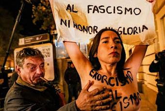 “Ahí estaban los ejecutores de la barbarie. La familia del dictador Francisco Franco y la fundación que lleva su nombre convocaron una misa en su (maldita sea) memoria. Dos activistas de Femen se presentaron en la puerta con sendas pancartas donde se podía leer ‘FASCISMO LEGAL, VERGÜENZA NACIONAL’. Iban como acostumbran, desnudas de cintura para arriba, en representación de todas y todos las que no estábamos. Su protesta solitaria debería haber sido una concentración multitudinaria, pero, entonces, un hombre alargó el brazo y le tocó la teta a una de las jóvenes. Ella le reprendió y las dos mujeres intercambiaron sus lugares. Acto seguido, el mismo hombre volvió a alargar el brazo y le tocó una teta a la otra. Tocó ambas tetas como en un chiste de ‘viejos verdes’ de los tiempos del dictador al que iba a honrar, tiempos en los que se llamaba ‘viejo verde’ a un hombre mayor que agredía sexualmente, de una manera u otra, a una mujer joven. Se encontraba normal que los hombres mostraran su poder en las calles, los platós de televisión, las películas, ejerciendo violencia sexual —verbal o física— contra mujeres cuyo aspecto respondía a los cánones macho de belleza de la época.