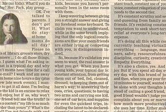Por si alguien tiene problemas con el idioma, hago un resumen. Esta es una columna tipo consultorio del Washington Post. En el recorte que he escaneado, una chica le comenta a "la experta" que su mejor amiga tiene hijos y está agotada, muy ocupada, sin tiempo para ella misma y, por supuesto, sin tiempo para atender su amistad. Pero ella no lo comprende. ¿Qué hace una mamá que no trabaja en su día a día?. Según ella, básicamente tocarse el higo. Porque actividades como ir a la compra, hacer la colada, son actividades que ella, que trabaja fuera de casa, también hace y sin quejarse. Al final, más que preguntar asegura que su amiga y, en general, las madres con hijos que no trabajan, aprovechan la excusa para tomarse un tiempo de descanso y disfrute y en lugar de reconocerlo, mienten haciéndose las víctimas.