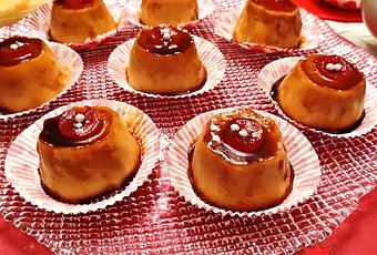 Caramelizamos el molde o los moldes y vertemos el preparado. Dejamos enfriar del todo y seguidamente los metemos en el frigo. Mejor dejarlo de un día para otro. Desmoldamos sobre capsulas de papel (en caso de ser individuales). Decoramos con unas guidas confitadas (yo las he cortado en rodajas) y le he puesto unas perlitas para decorarlos.