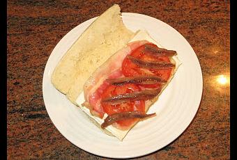 Abrimos el pan y colocaos en una parte el tomate y las anchoas y en la otra el queso y se le echa el bacon recién cocinado encima para que se derrita un poco. Tapamos el bocadillo y listo para comer. Es un bocado que sorprende por mezclar el sabor de las anchoas y el bacon.