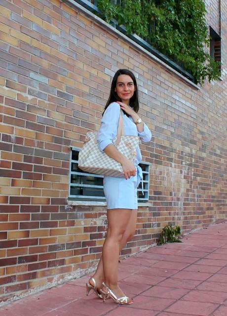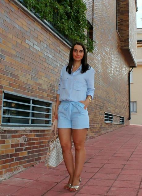 Shirt- Bershka. Shorts- Sheinside. Bag- Louis Vuitton. Sandals- Sfera. En el look de hoy no os muestro nada que no hayáis visto ya por el blog; todo lo que veis son prendas de otras temporadas pero me pareció interesante el resultado de esta combinación con prendas en azul que casi consiguen el efecto mono ( por lo parecido de los tonos de ambas prendas )y quería mostrárosla. La sesión de fotos corresponde al lunes de la semana pasada en la que hizo un poco de "fresquete" y tuvimos que volver (por algunos días) a las camisas y las cazadoras . Me gusta mucho combinar prendas que tienen colores tan similares que parecen una sola pieza. También vosotras recurrís a ese truco? espero que os haya gustado mi look de hoy. Nos leemos. Muakss:) Gracias por vuestros comentarios. Thanks for your lovely comments, always.