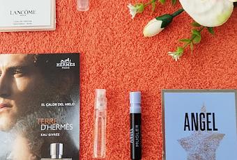 En primer lugar podéis ver unas cuantas muestras de perfumes: La vie est belle de Lancôme y Angel de Mugler para mujer y también Terre D´Hermés para hombre. Las tres nos han gustado, su perfume es muy agradable y duradero.