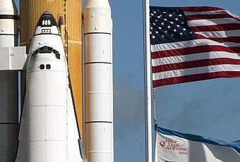 Izquierda: El Transbordador Espacial Endeavour, esperando el momento de lanzamiento en el Centro Espacial Kennedy. Crédito: NASA/Kim Shiflett.
