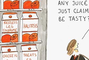 La viñeta que encabeza esta entrada lo dice todo... Mil zumos, mil reclamos publicitarios (la mayoría relacionados con la salud) y el pobre consumidor preguntando por alguno que esté rico. El autor es el gran Tim Fishburne, que además habla del tema en este breve artículo.
