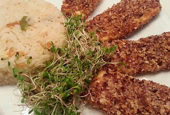 - Cortamos el tofu en lonchas y pasamos cada una primero por la mezcla de harina y agua con gas y después por las almendras trituradas.