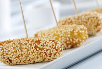 Para servir con salsa de soja y una guarnición de cebollas verdes. Asegúrate de utilizar tofu firme. Tuéstalo a la plancha suavemente para que pierda un poco de humedad antes de recubrir con pan rallado y semillas de sésamo.