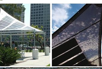 Como funciona la arquitectura de los toldos solares: Se trata de incorporar a un tejido resistente láminas flexibles con células solares, consiguiendo que una superficie que puede dar sombra sea capaz también de proporcionar energía solar.