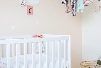 La cuna es sencilla y para la pared nada mejor que unos stickers o vinilos de lunares blancos , una solución muy muy socorrida si quieres hacer algo diferente sin invertir en un papel de pared o cambiar el color de la pintura. Lo cierto es que este color rosa salmón que sin esos vinilos no diría nada, cambia totalmente con una decoración pastel donde el amarillo, la madera natural y el mint juegan un gran papel.