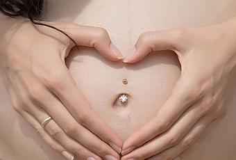 Hands of expectant mother on her tummy. Pregnant woman posing a heart with her fingers on her naked belly with piercing in belly button