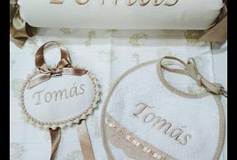 Para él me pidieron un antivuelco, una medallita y un babero, todo en tonos beige y camel.