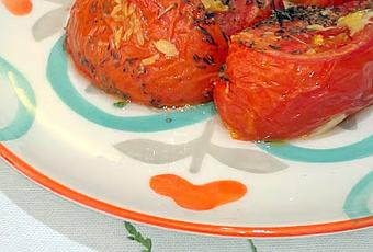 Muchas veces he dicho lo que me gusta el tomate, así que esta es la receta que me enamoró nada mas verla "Tomates asados con tomillo"