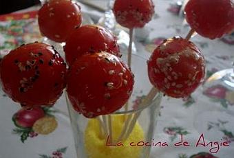 - Preparar un caramelo líquido con azúcar y una chispa de agua; cuando ya esté dorado, apartar del calor y pasar los tomates por el caramelo y luego por semillas de sésamo. Meter los palillos en una copa llena de sal gruesa o azúcar y dejar enfriar.